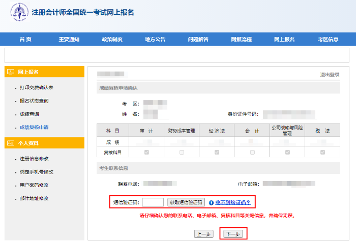 第二步:进入后阅读《注册会计师成绩复核管理办法》,点击下一步;