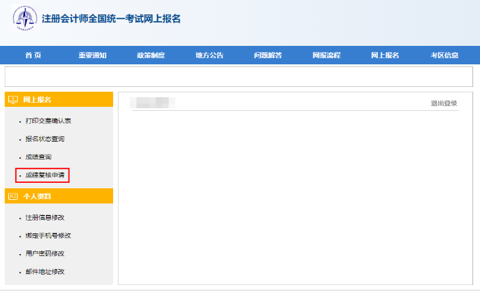 第一步:登录网上报名系统,点击左侧成绩复核申请;
