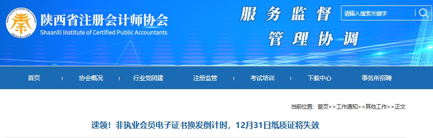 近日,陕西省注册会计师协会发布提醒:注册会计师非执业会员电子证书换发倒计时,12月31日纸质证将失效。详情如下: