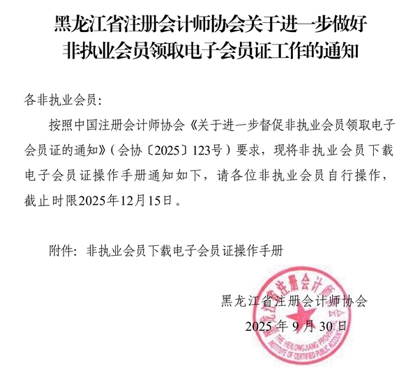 近日,黑龙江注册会计师协会发布了《黑龙江省注册会计师协会关于进一步做好 非执业会员领取电子会员证工作的通知》,领取时间截止到2025年12月15日。