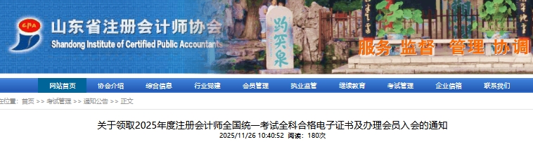 11月26日,山东省注册会计师协会发布了《关于领取2025年度注册会计师全国统一考试全科合格电子证书及办理会员入会的通知》,取得职业能力综合测试合格成绩的考生,可于成绩发布5个工作日后,在注册会计师全国统一考试网上报名系统自行查询、下载电子证书。