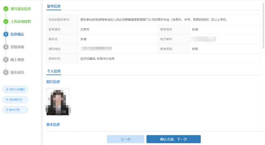 9.点击下一步后进入到信息确认页面,信息确认页面展示报考信息、个人信息(照片信息、基本信息、学历信息、学位信息、工作信息)、附件信息。