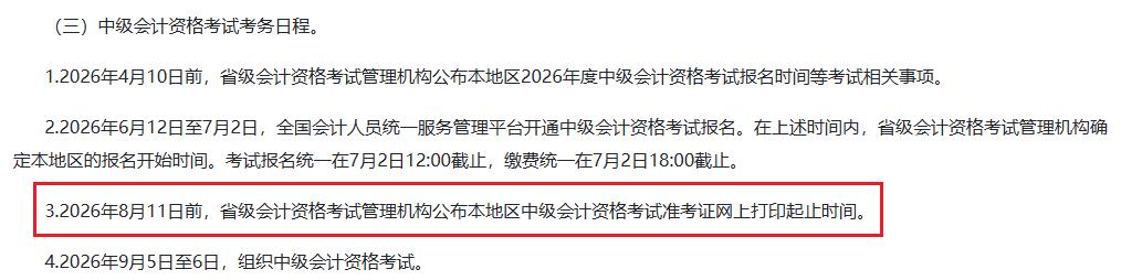 根据青海省会计信息服务平台发布的《关于2026年度全国会计专业技术资格考试 (青海考区)考务日程安排及有关事项的通知》可知:2026年8月11日前,省级会计资格考试管理机构公布本地区中级会计资格考试准考证网上打印起止时间。