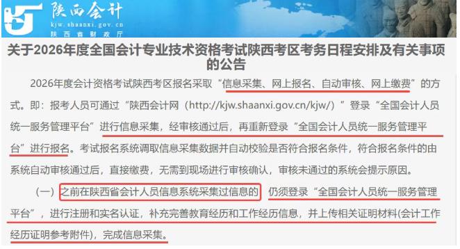 之前在陕西省会计人员信息系统采集过信息的,仍须登录“全国会计人员统一服务管理平台”,进行注册和实名认证,补充完善教育经历和工作经历信息,并上传相关证明材料(会计工作经历证明参考附件),完成信息采集。