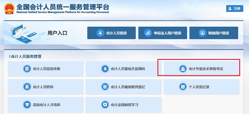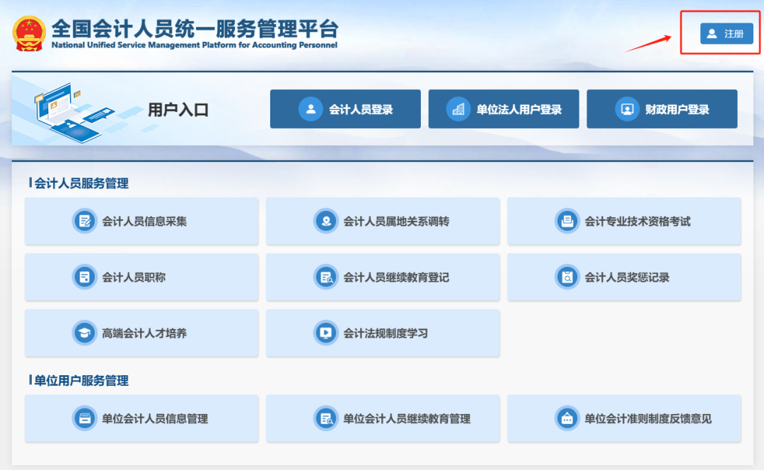 第一步:进入全国会计人员统一服务管理平台网址为:https://ausm.mof.gov.cn /index ;点击右上角“注册”按钮,进入到注册操作页面;