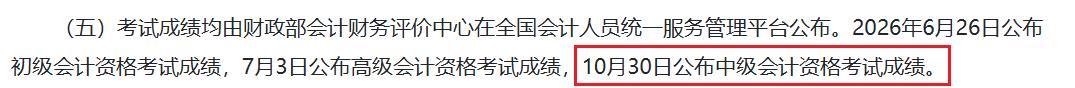 根据山东会计信息网发布的《山东省财政厅 山东省人力资源和社会保障厅关于做好2026年度全国会计专业技术资格考试报名工作的通知》可知:10月30日公布中级会计资格考试成绩。