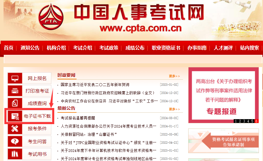 1、进入中国人事考试网(http://www.cpta.com.cn/index.html)————点击【电子证书下载】按钮;