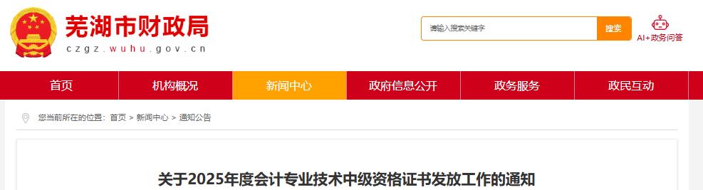 芜湖市财政局发布了《关于2025年度会计专业技术中级资格证书发放工作的通知》通知中明确了2025安徽芜湖中级会计证书邮寄申请时间为1月22日至3月10日。线下自取需要3月18日以后到指定地点领取。