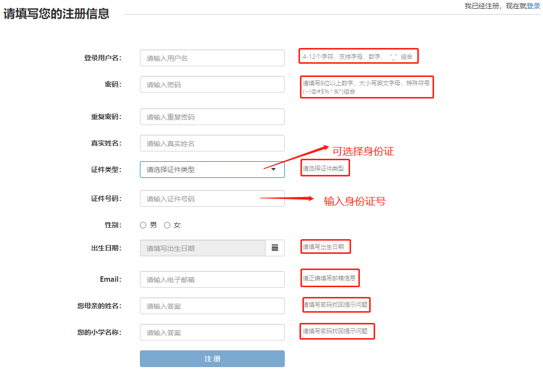 第六步:注册完成后,返回登录页面,输入之前注册的账号、密码、验证码进行登录,点击“正式报名”;