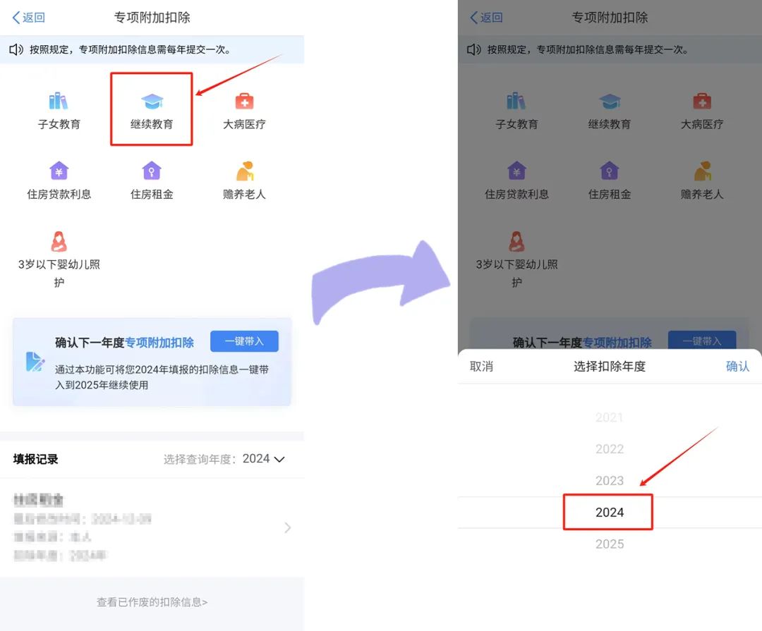 选择“继续教育”,并根据需要选择扣除年度,注意扣除年度应为证书上的批准日期所在年。