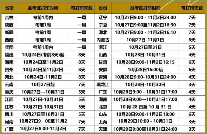 全国多数地区:10月27日-10月31日(10月31日24:00截止)