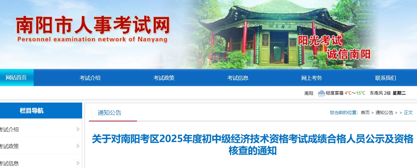 (一)按照有关要求,现对南阳考区2025年度初中级级经济技术资格考试成绩合格人员(见附件1)进行公示,接受社会监督。