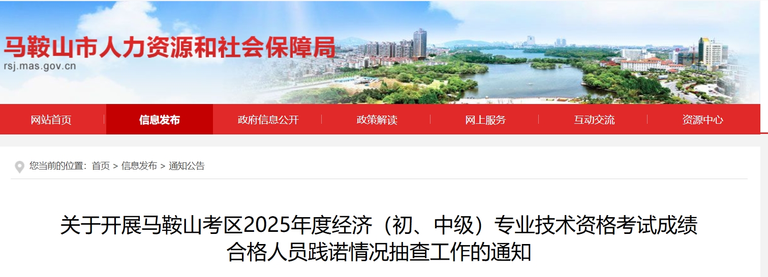 根据省人力资源社会保障厅《关于2025年度安徽省专业技术人员职业资格考试工作计划及有关事项的通知》(皖人社秘〔2025〕19号)精神及资格考试报名证明事项告知承诺制有关要求,拟于近期开展马鞍山考区2025年度经济(初、中级)专业技术资格考试成绩合格人员践诺情况抽查工作,现将有关情况通告如下: