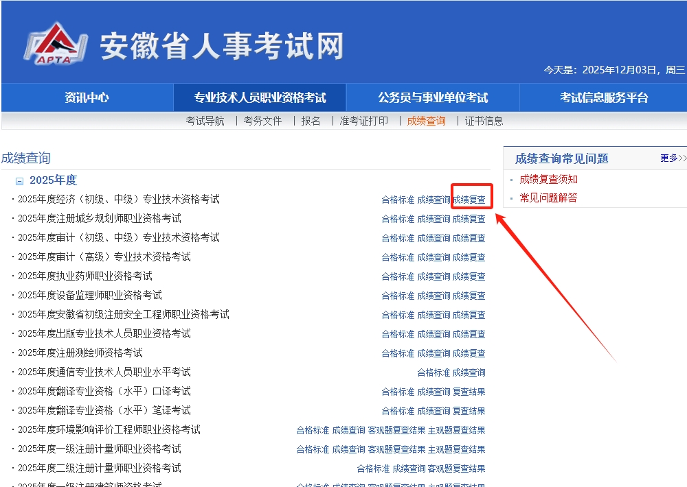 安徽2025年中级经济师成绩复核统一通过安徽人事考试网(http://www.apta.gov.cn/)在线提交。登录后点击"成绩复核"栏目,选择"2025年度经济专业技术资格考试",填写相关信息并上传必要证明材料。