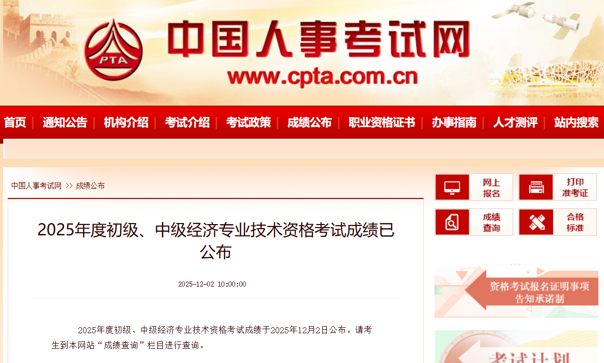 2025年中级经济师成绩查分入口已于12月2日上午10时正式开通。2025年中级经济师成绩查分入口设在中国人事考试网(www.cpta.com.cn),考生需使用报名时的账号密码登录查询。2025年中级经济师成绩查分入口开放初期访问量较大,建议错峰查询。