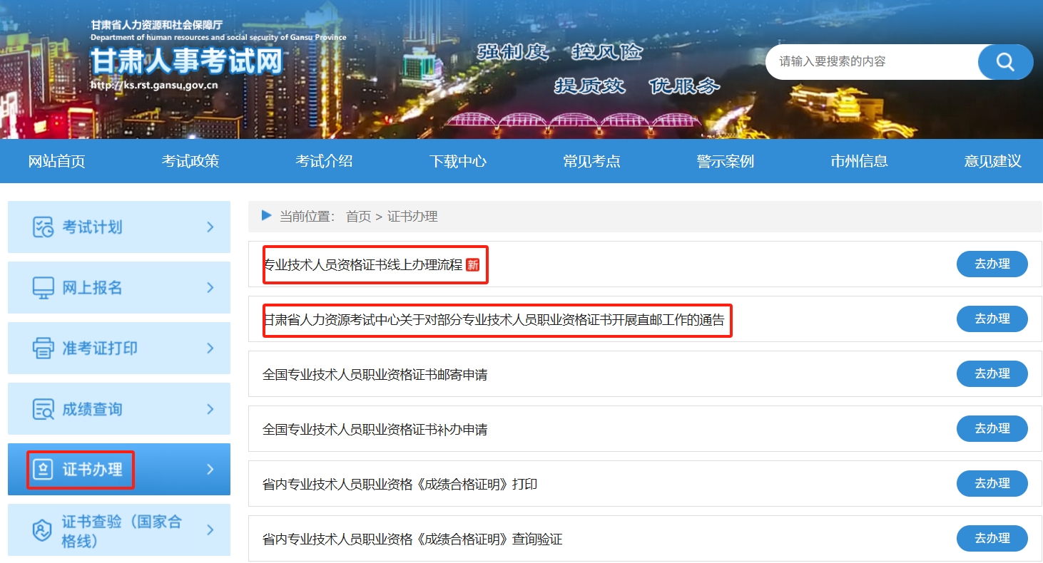 甘肃:登录甘肃人事考试网(https://ks.rst.gansu.gov.cn/ncms/),点击"证书办理"栏目,选择"全国专业技术人员职业资格证书邮寄申请"。在线注册并准确填写收件人姓名、联系电话、地址等信息。