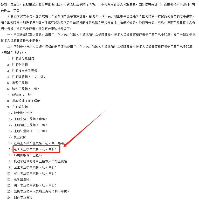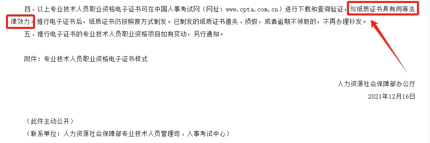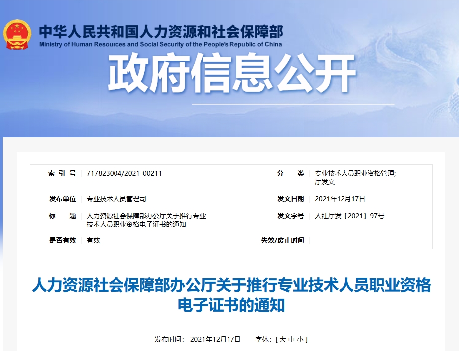 人社部办公厅于2021年12月17日正式印发《关于推行专业技术人员职业资格电子证书的通知》,明确规定使用"中华人民共和国人力资源和社会保障部专业技术人员职业资格证书专用章"电子印章的电子证书,与纸质证书具有同等法律效力。这一政策适用于经济专业技术资格(初、中级)等24项专业技术人员职业资格。