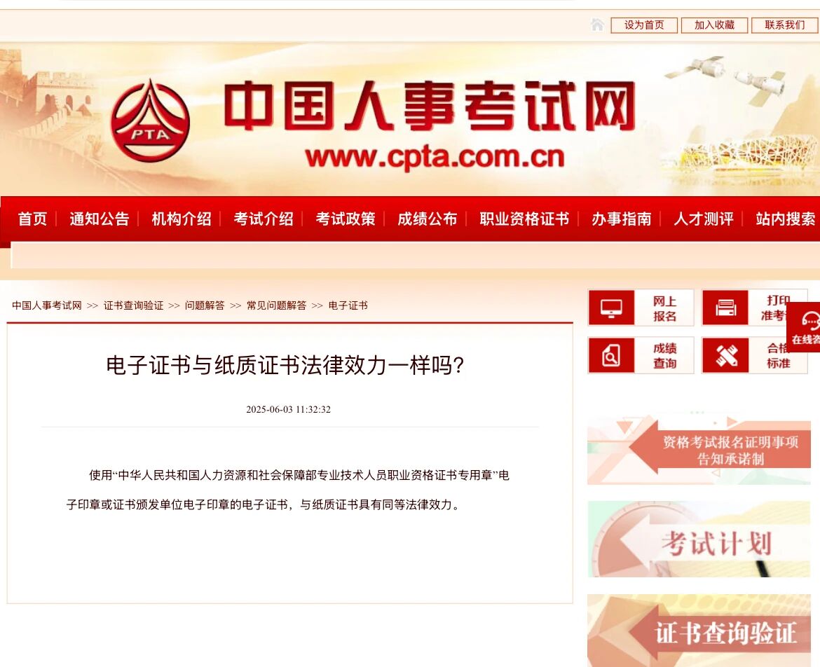 电子证书在全国范围内长期有效,可用于职称评定、岗位晋升、积分落户、个税专项扣除等多种场景。电子证书加盖的电子印章与纸质证书的实体印章具有同等法律效力,任何形式的电子再转换版本不具备同等法律效力。