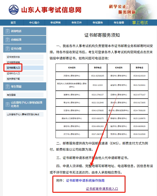 方式一:登录“山东人事考试信息网”点击“考后服务”栏目,选择“证书直邮”办理。