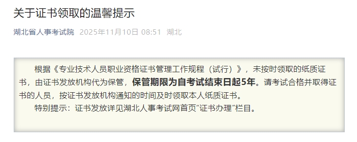 特别提示:证书发放详见湖北人事考试网首页“证书办理”栏目。
