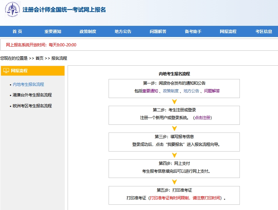 注册会计师全国统一考试网上报名系统中显示了网上报考流程图: