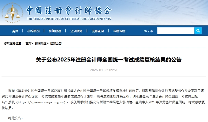 《关于公布2025年注册会计师全国统一考试成绩复核结果的公告》中明确:2025年cpa成绩复核结果于2026年1月23日公布,查询入口为注册会计师全国统一考试网上报名系统。