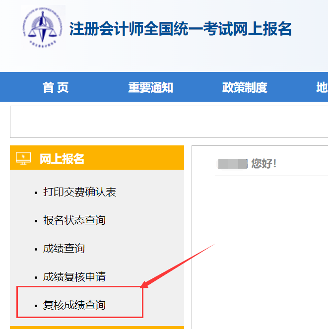 第二步:点击左侧“复核成绩查询”即可查看本人2024年注册会计师全国统一考试成绩复核结果。