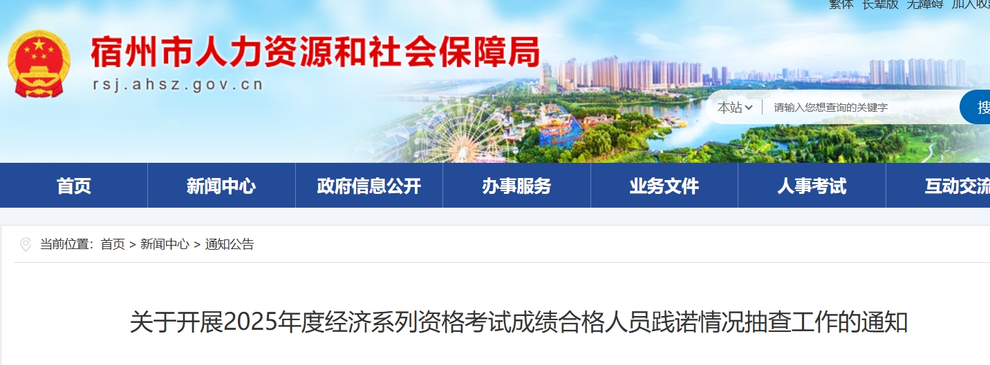 2025年安徽宿州中级经济师考试成绩合格人员践诺情况抽查工作已启动。根据2025年安徽宿州中级经济师资格后审通知,本次从全市合格考生中随机抽取9人(不低于合格总人数的5%),开展考后资格复核,确保告知承诺制规范实施。