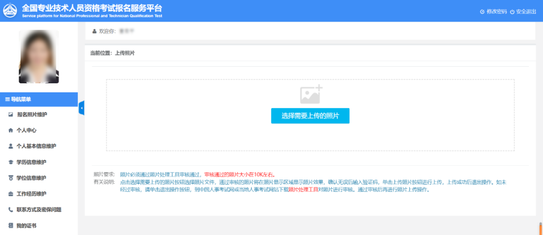 仔细阅读照片要求和有关说明,点击【选择需要上传的照片】按钮,选择待上传的照片,照片显示在待上传区域。点击【上传照片】按钮。如图: