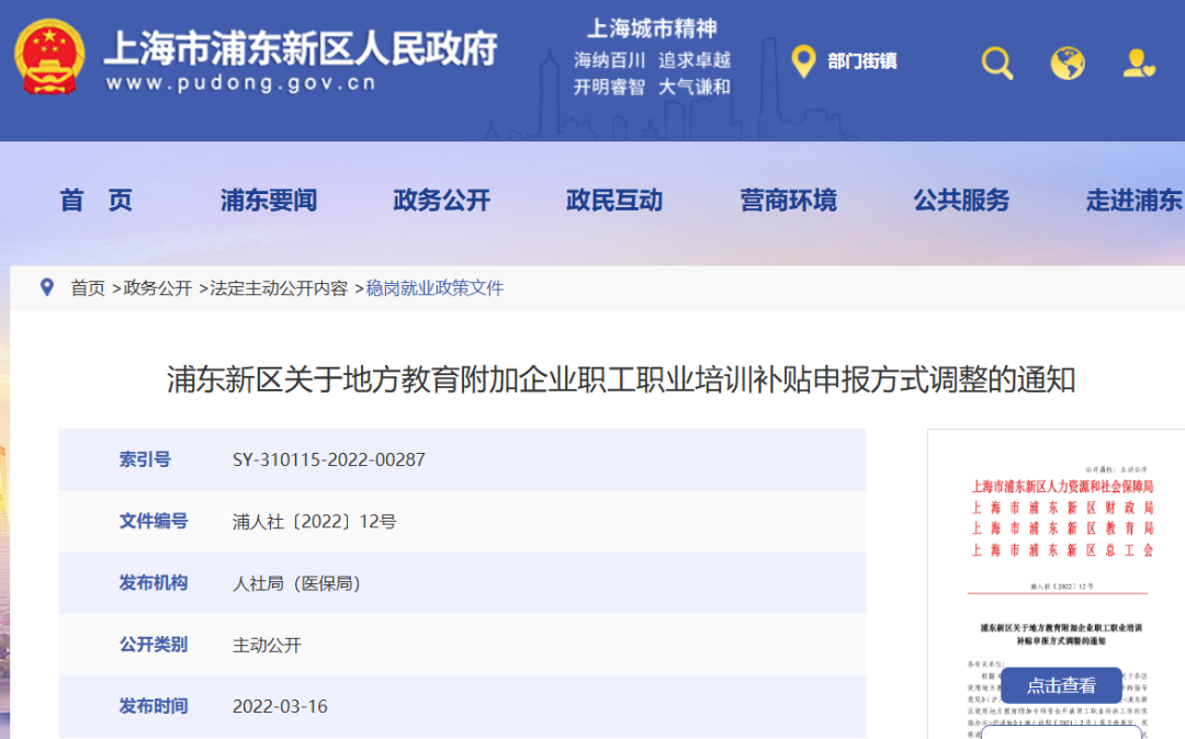 浦东新区地方教育附加企业职工职业培训补贴政策