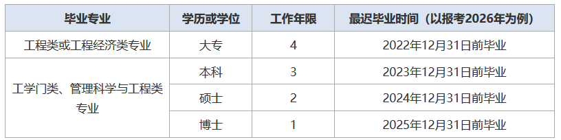 全日制学历:例如,某人2021年7月取得全日制学历后参加工作无后续学历,2026年报考一级建造师,工作年限从2021年7月后开始计算,截止至2026年12月31日,共计4年半时间。