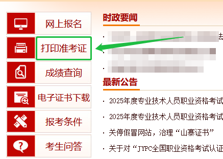 进入「中国人事考试网」首页,找到左侧【打印准考证】入口。