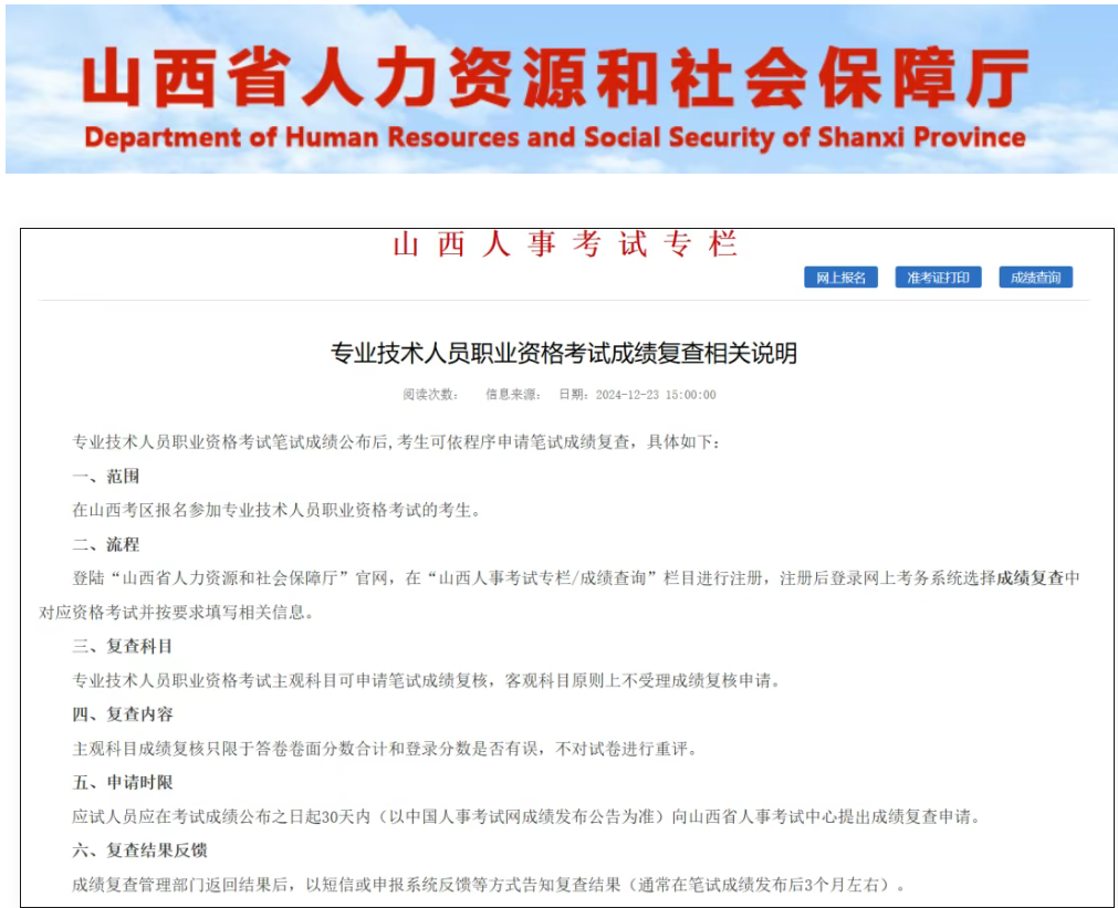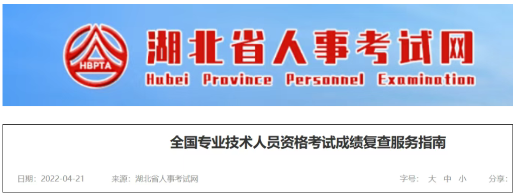 应试人员对资格考试成绩有异议的,应在考试成绩公布后30天内(含休息日),登录湖北省人事考试网https://rst.hubei.gov.cn/hbrsksw/点击“成绩复查”栏目提交复查申请;省人事考试院在考试成绩公布后40天内(含休息日),汇总上报全省的复查信息;省人事考试院收到上级反馈的复查结果后(三天内)上网发布复查结果。成绩复查进度和结果统一在“湖北人事考试网”考试服务-成绩复查中予以公布。