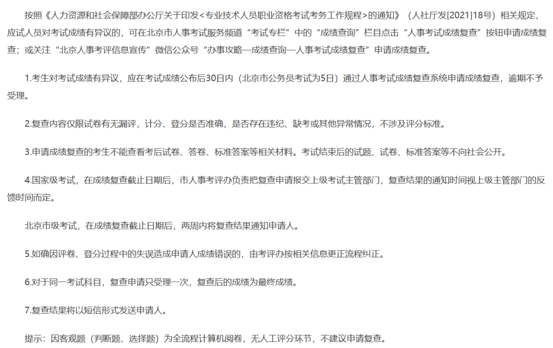 客观试题原则上不参与成绩复核。对参加考试但成绩为缺考、违纪、零分、无效等异常成绩情况的,可提出复核申请,除上述情形外,不受理成绩复核申请。