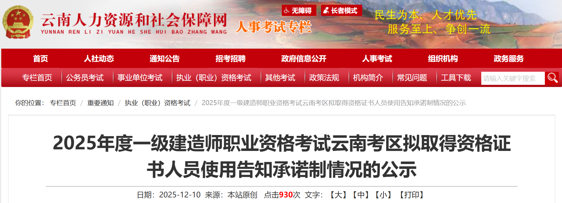 2025年度一级建造师职业资格考试成绩已公布,云南考区共3490人拟取得资格证书。其中6人不使用告知承诺制,1人不适用告知承诺制,1人撤回承诺,以上8人已在报名期间完成资格核查,不再公示。根据证明事项告知承诺制有关规定要求,现对使用告知承诺制报名的3482名人员(详见附件)予以公示,公示期为5个工作日,自2025年12月10日至12月16日。