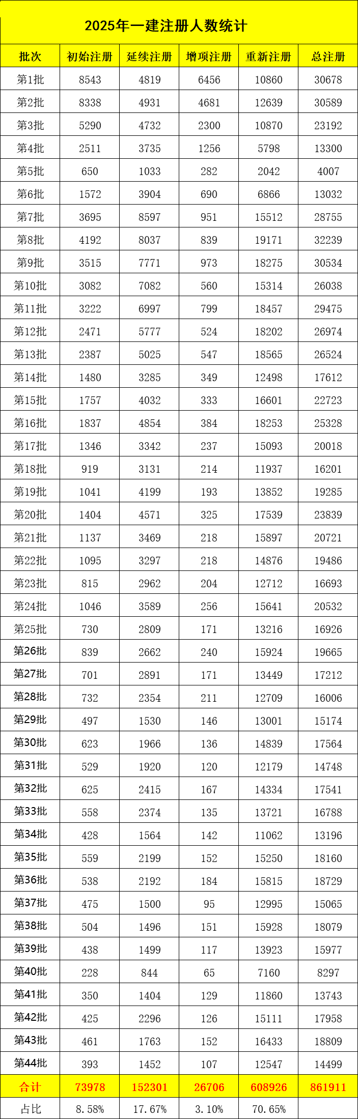 2025年第四十三批一级建造师注册人员名单公告已发布,本批次共18809人符合一级建造师注册条件,其中,初始注册共461人,延续注册1763人,增项注册152人,重新注册16433人。具体公告如下: