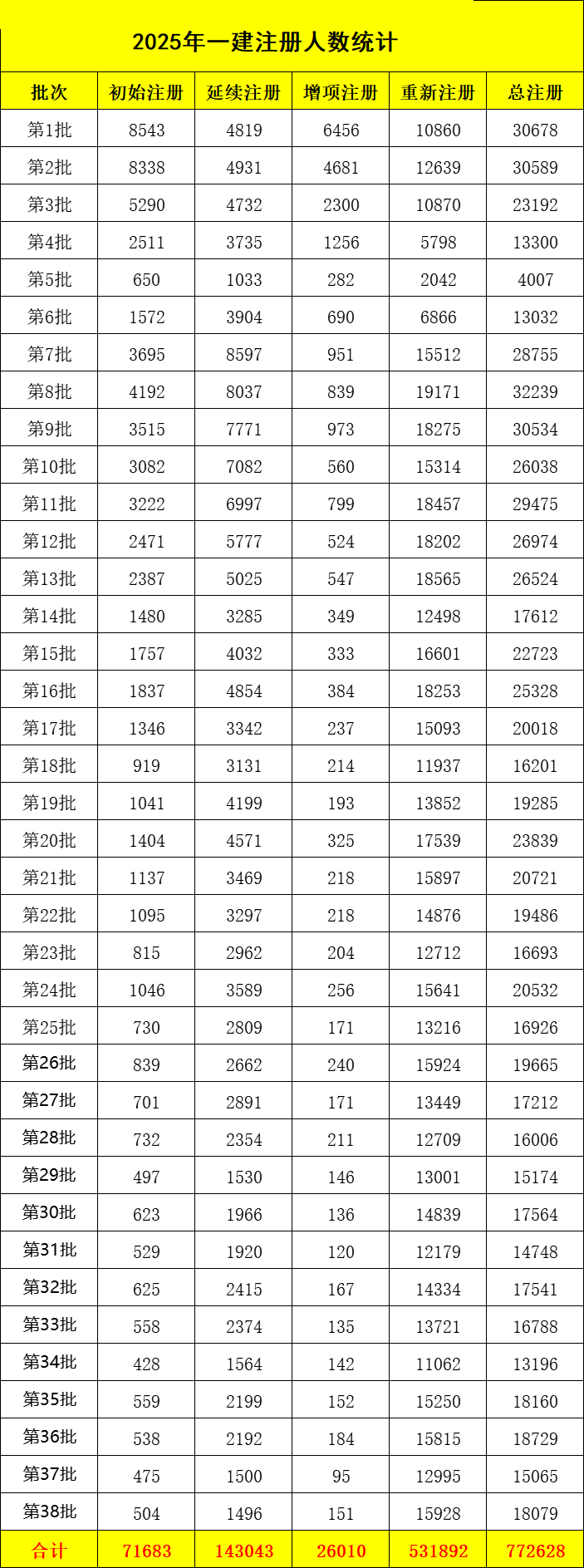 截止目前,住建部已公布1-38批次注册名单,总注册人数为772628,具体如下: