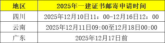 四川、云南、广东2025年一级建造师证书直邮申请已开始,申请时间如下: