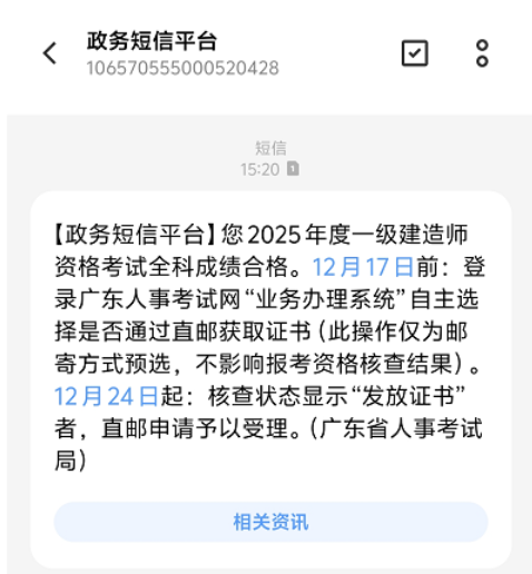 2025年广东一级建造师证书可以申请直邮了!不少考生已经收到广东省人事考试局发送的证书直邮短信通知了,短信内容如下: