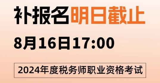 中国注册税务师协会发布重要提醒:2024年度税务师职业资格考试补报名8月16日17点,考生一定要在时间截止前完成报名,补报名入口是税务师职业资格考试报名系统。