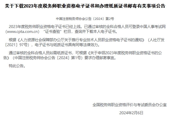 2023年税务师电子版证书上线通知
