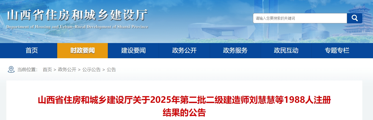 山西省住房和城乡建设厅于近日发布《关于2025年第二批二级建造师1988人注册结果的公告》,经审核,符合以上批次二级建造师初始注册、增项注册、重新注册、注销注册等符合条件人员一共有1988人。