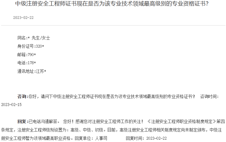 高级注册安全工程师相关制度规定尚未制定颁布,中级注册安全工程师暂为该领域最高职业资格。