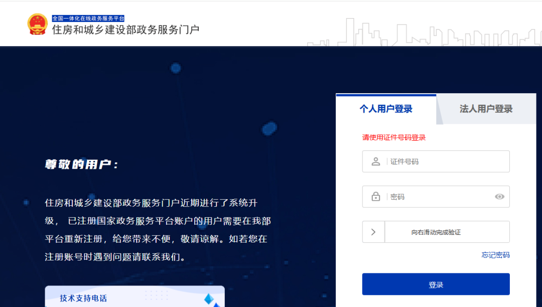 2、进入住房和城乡建设部政务服务门户网站后,没有注册的,按照提示完成个人账号注册。