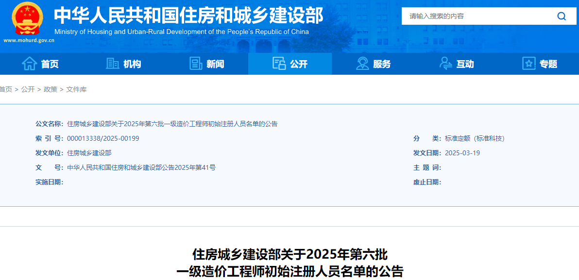 2025年第六批一级造价师初始注册人员名单公告通知原文如下: