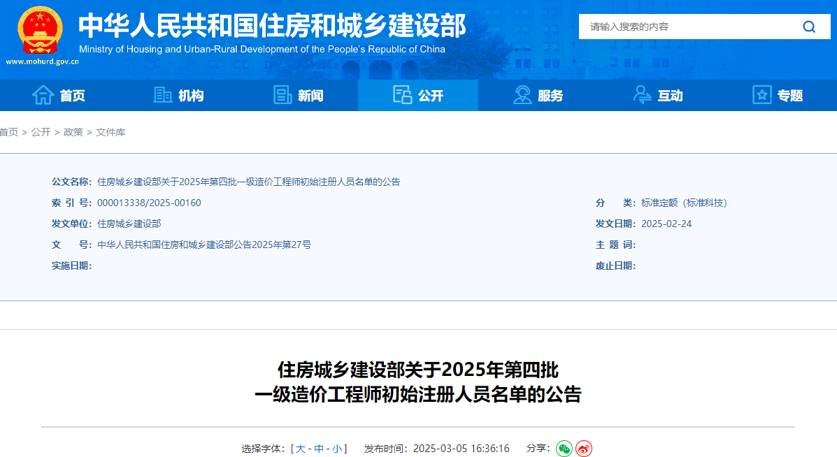 2025年3月5日,中华人民共和国住房和城乡建设部发布了《关于2025年第四批一级造价工程师初始注册人员名单的公告》,其中明确共有795人符合一级造价师初始注册条件,并对相关人员信息予以公示。