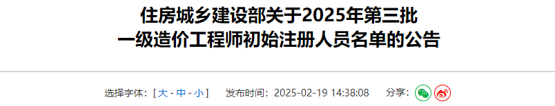 2025年第三批一级造价师初始注册人员名单公告原文如下: