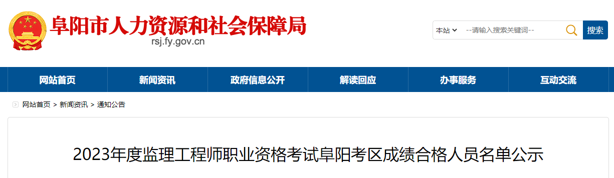 7月27日,阜阳市人力资源和社会保障局发布了“2023年度监理工程师职业资格考试阜阳考区成绩合格人员名单公示”,公示时间至2023年8月5日。