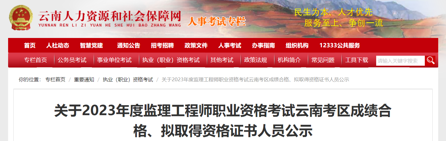7月28日,云南人力资源和社会保障网发布了“关于2023年度监理工程师职业资格考试云南考区成绩合格、拟取得资格证书人员公示”,公示期为7个工作日,自2023年7月28日至8月7日。