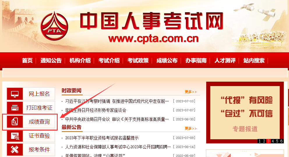 1、登录中国人事考试网(网址为http://www.cpta.com.cn),点击页面右侧的成绩查询;